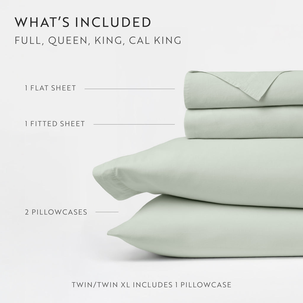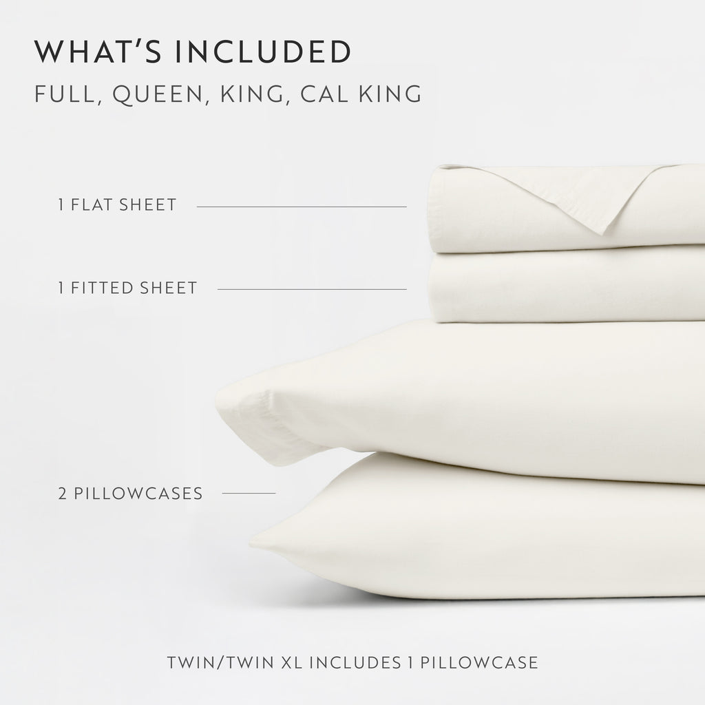 - KING: 1 flat sheet (108" x 102"), 1 fitted sheet (78" x 80" x 14") and 2 King pillowcases (20" x 40")