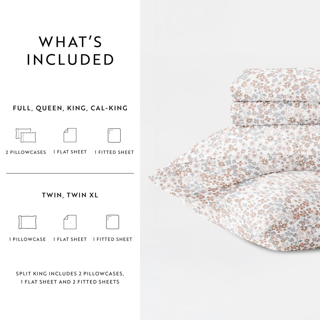 - KING: 1 flat sheet (108" x 102"), 1 fitted sheet (78" x 80" x 14") and 2 King pillowcases (20" x 40")