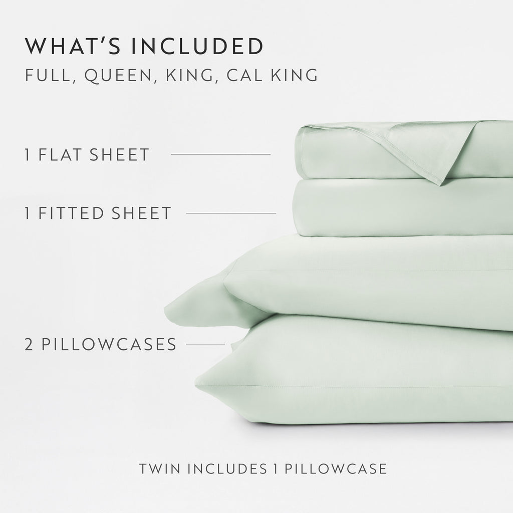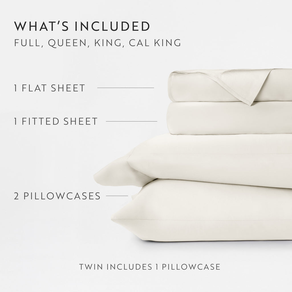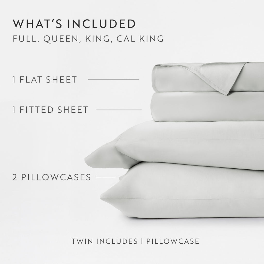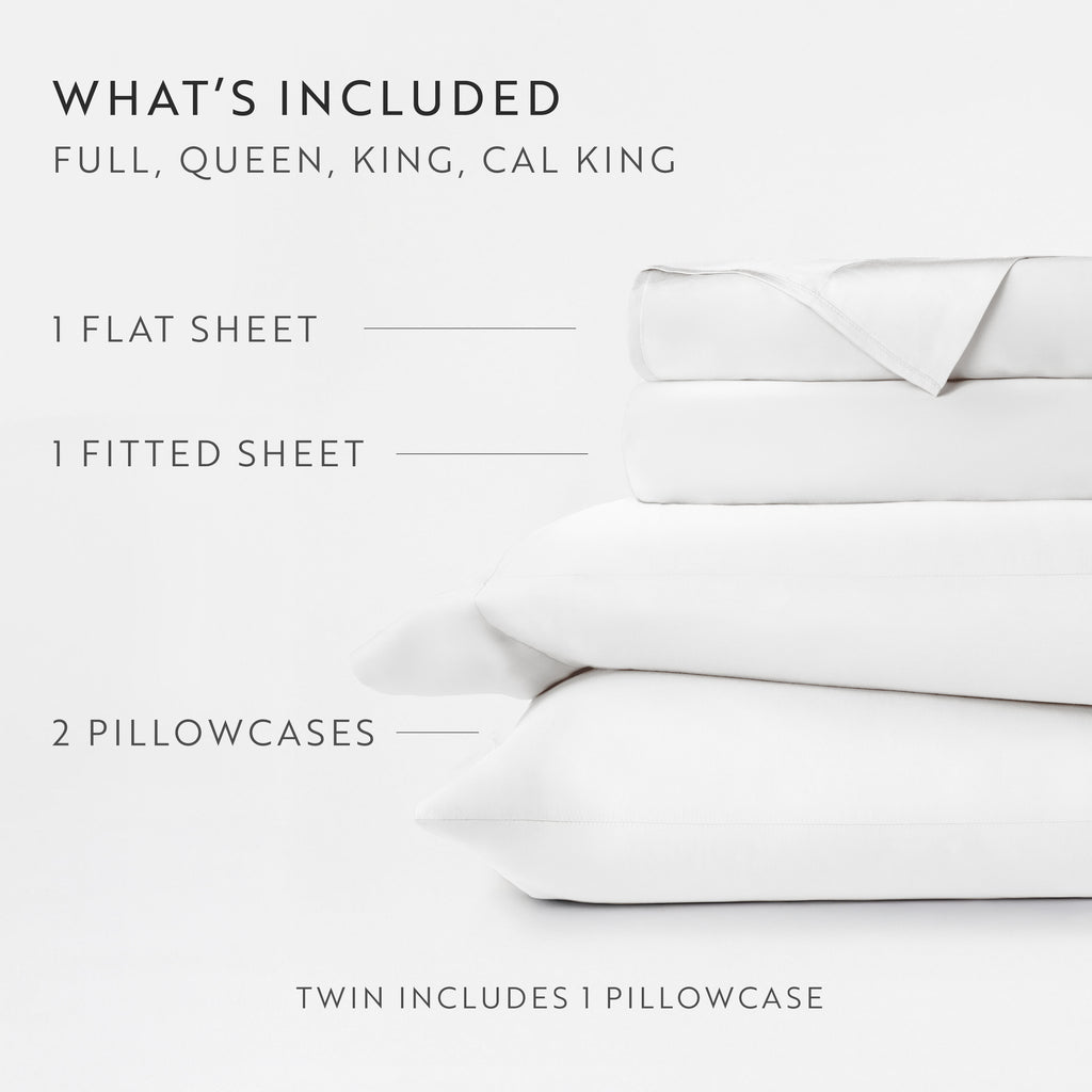 - KING: 1 flat sheet (108" x 102"), 1 fitted sheet (78" x 80" x 14") and 2 King pillowcases (20" x 40")