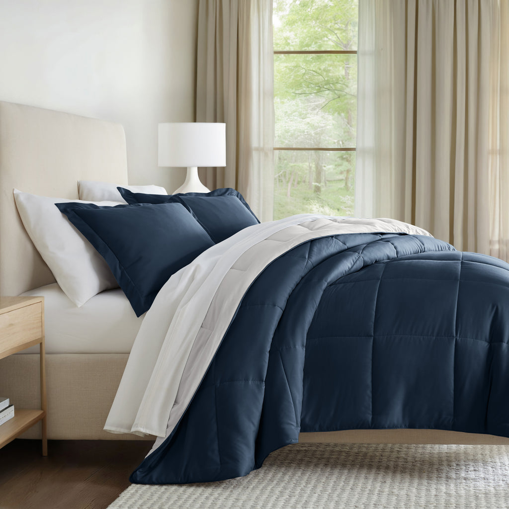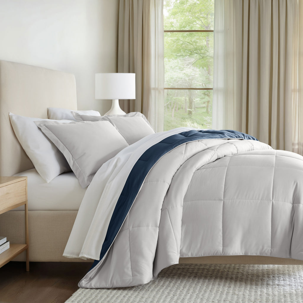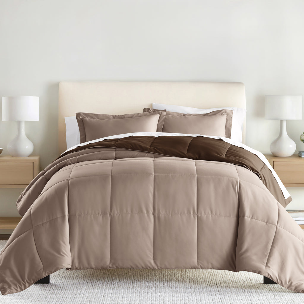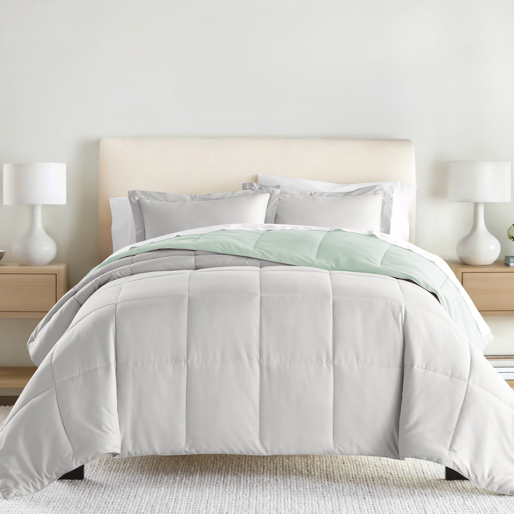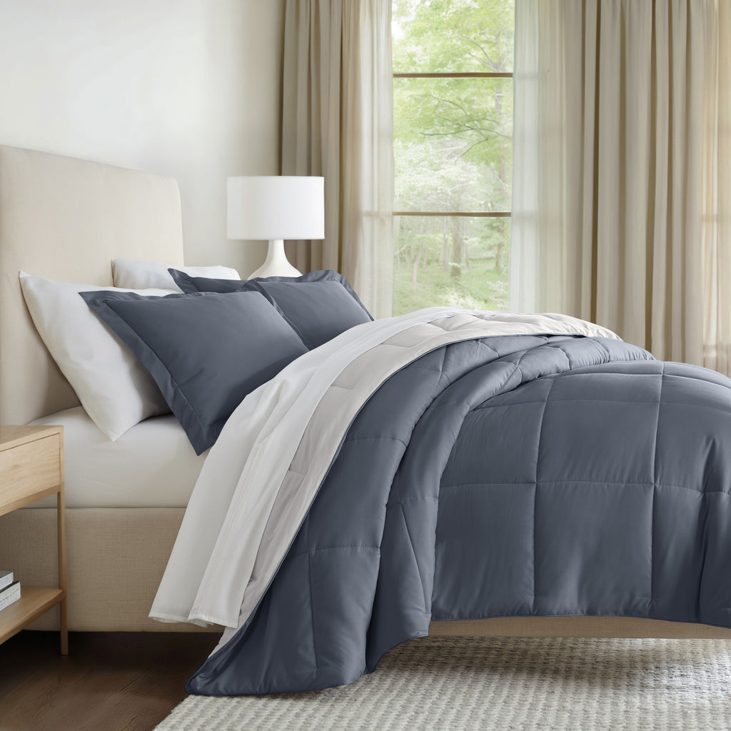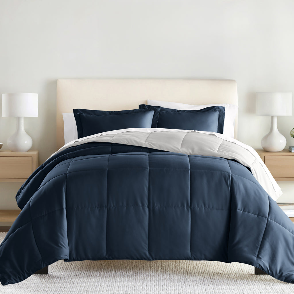 Give your bedding a brand new look and feel with this lightweight, all season reversible comforter set. Presenting a down alternative quality, it's incredible softness makes it the perfect comforter to keep you cozy all year round. The sewn through box stitching prevents the fibers from shifting. Featuring a reversible design of aesthetically matched colors, this set is ideal for making quick style changes to your sleep space!