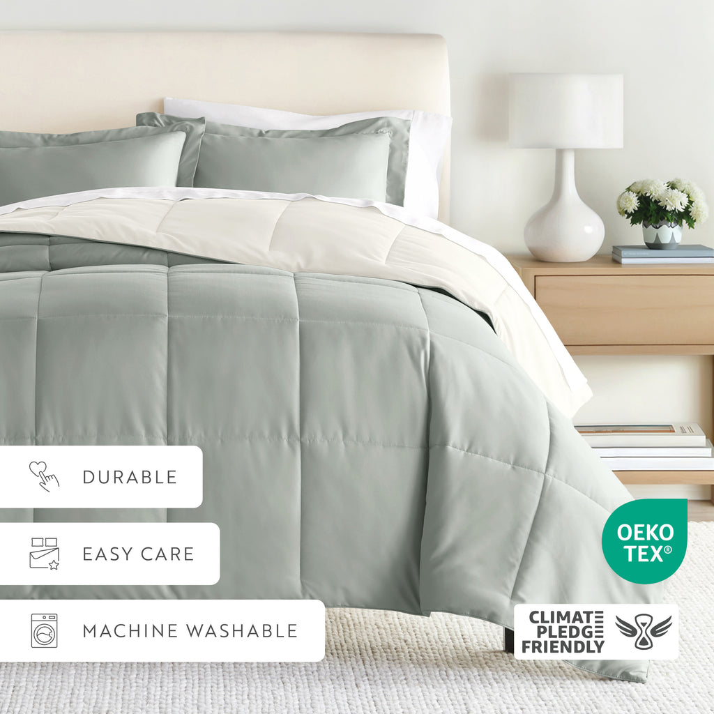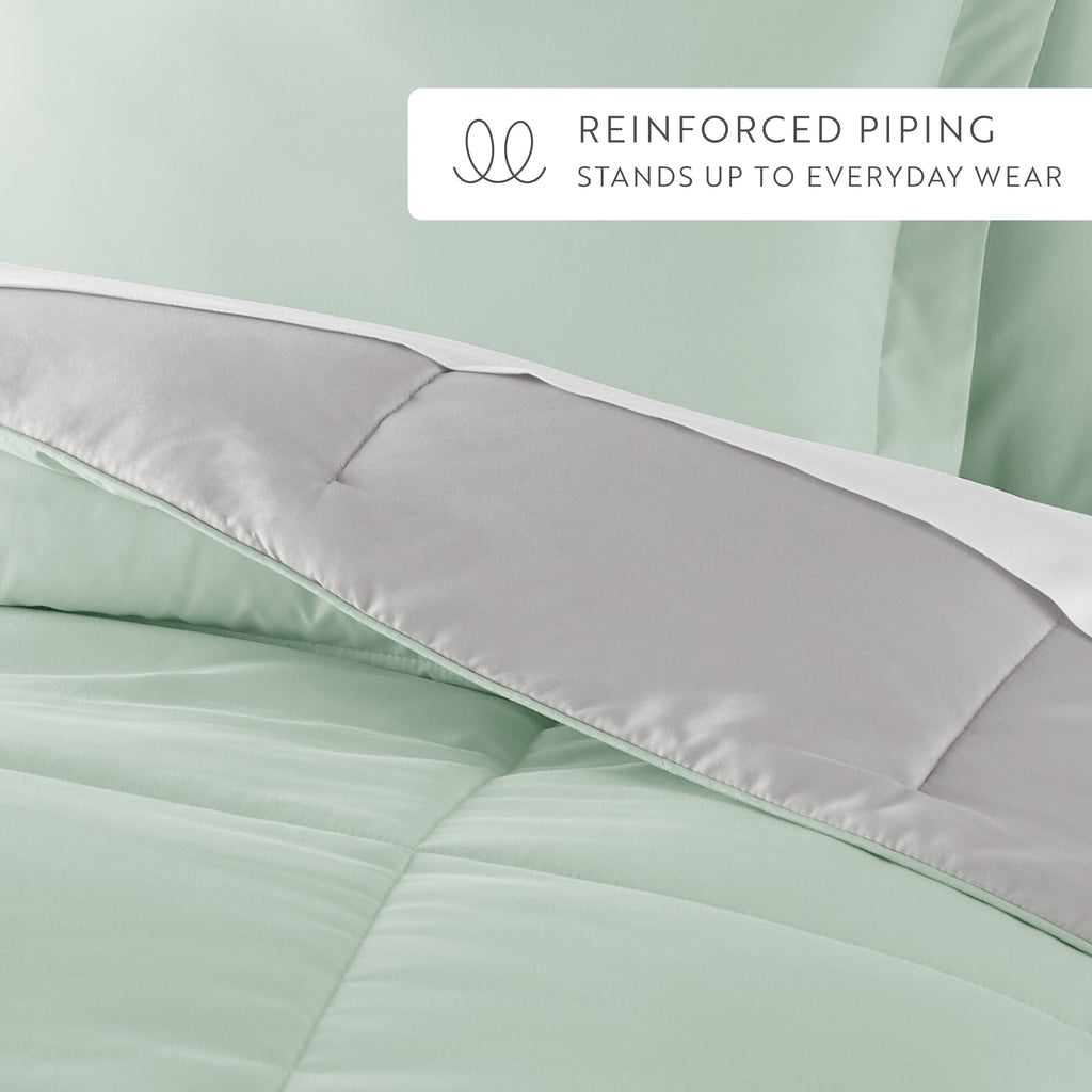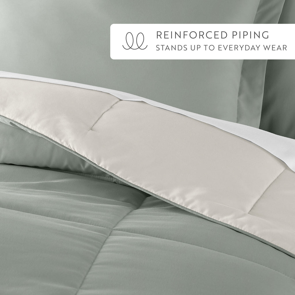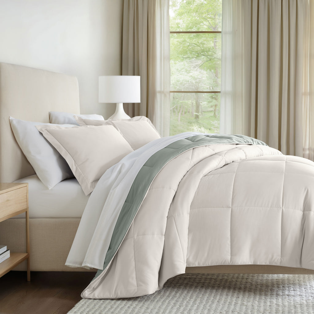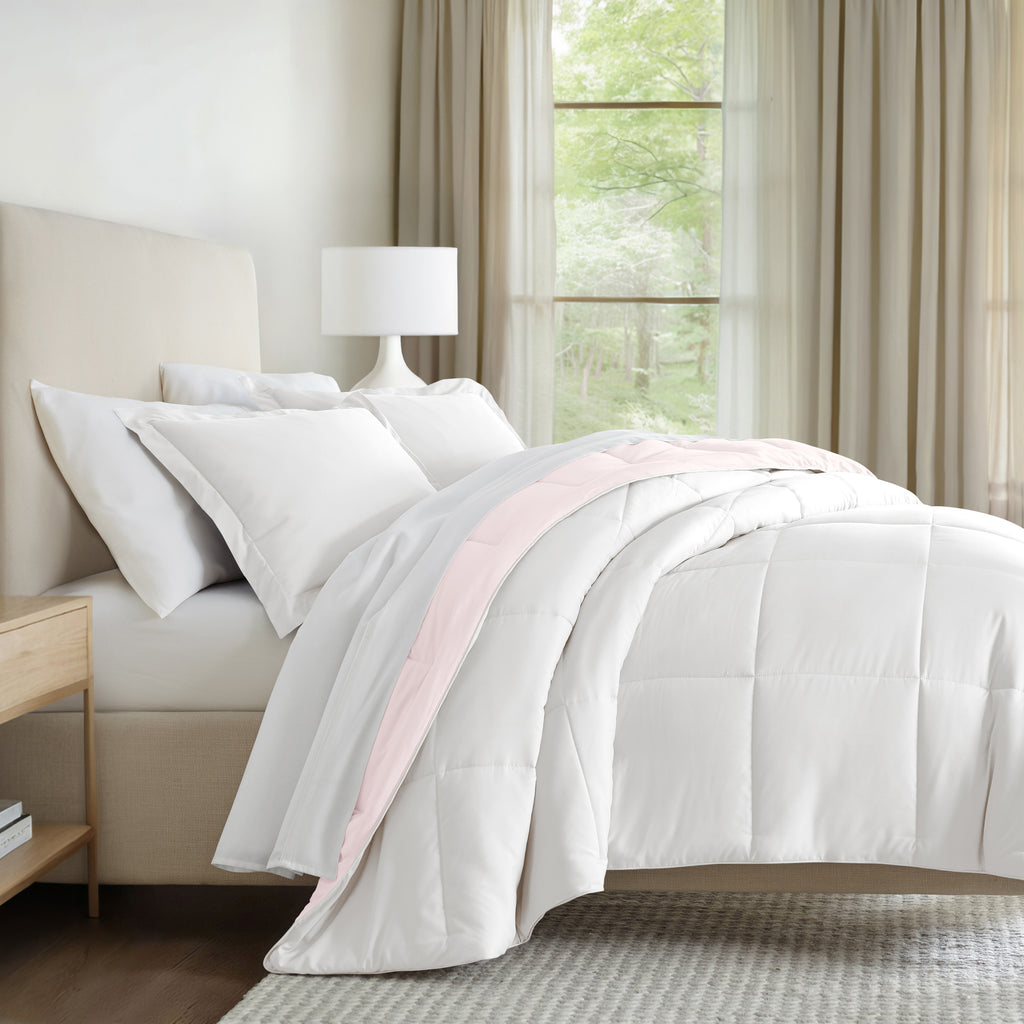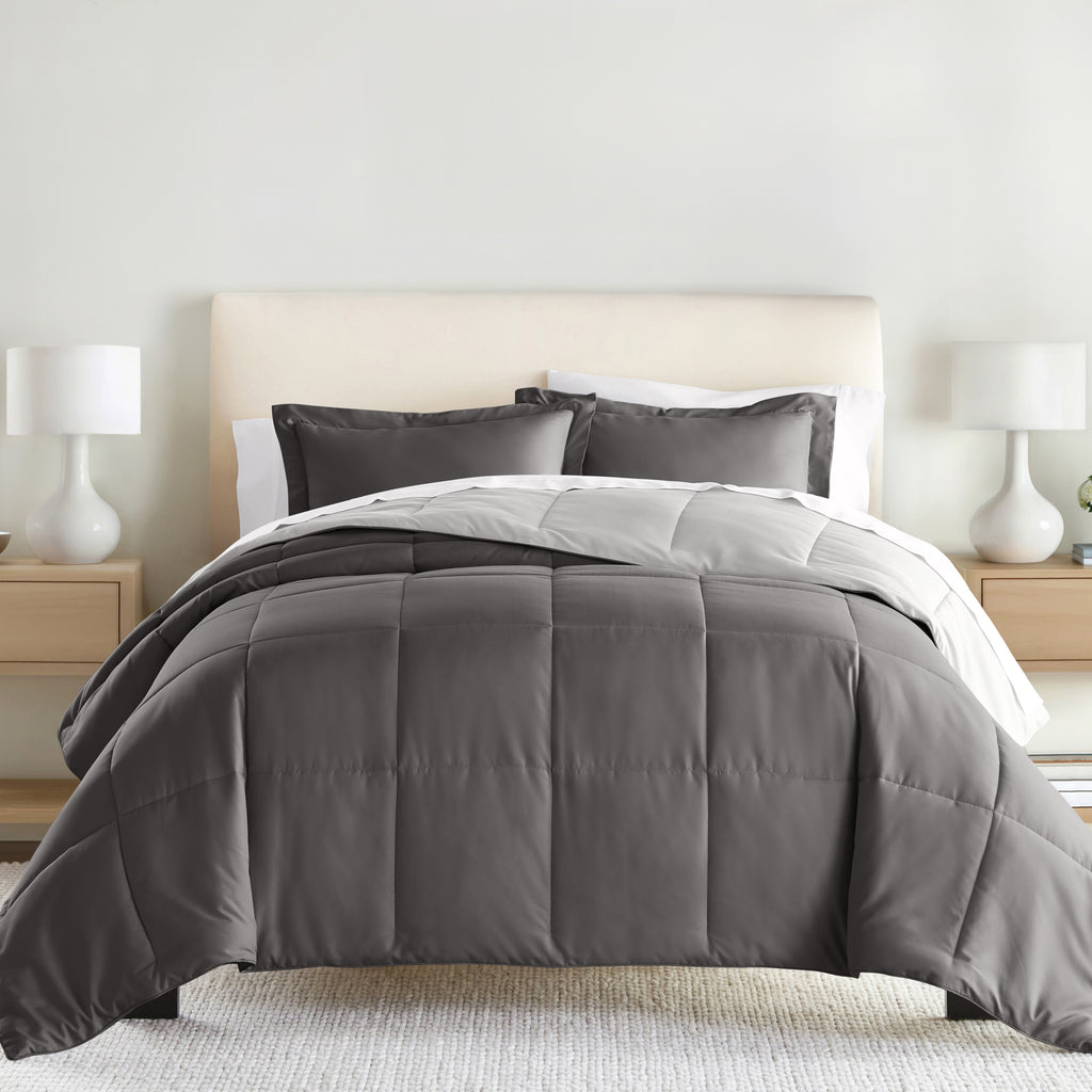 Give your bedding a brand new look and feel with this lightweight, all season reversible comforter set. Presenting a down alternative quality, it's incredible softness makes it the perfect comforter to keep you cozy all year round. The sewn through box stitching prevents the fibers from shifting. Featuring a reversible design of aesthetically matched colors, this set is ideal for making quick style changes to your sleep space!