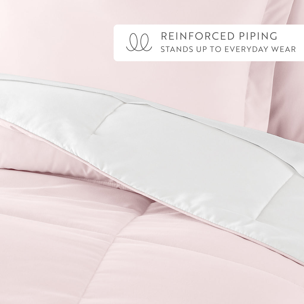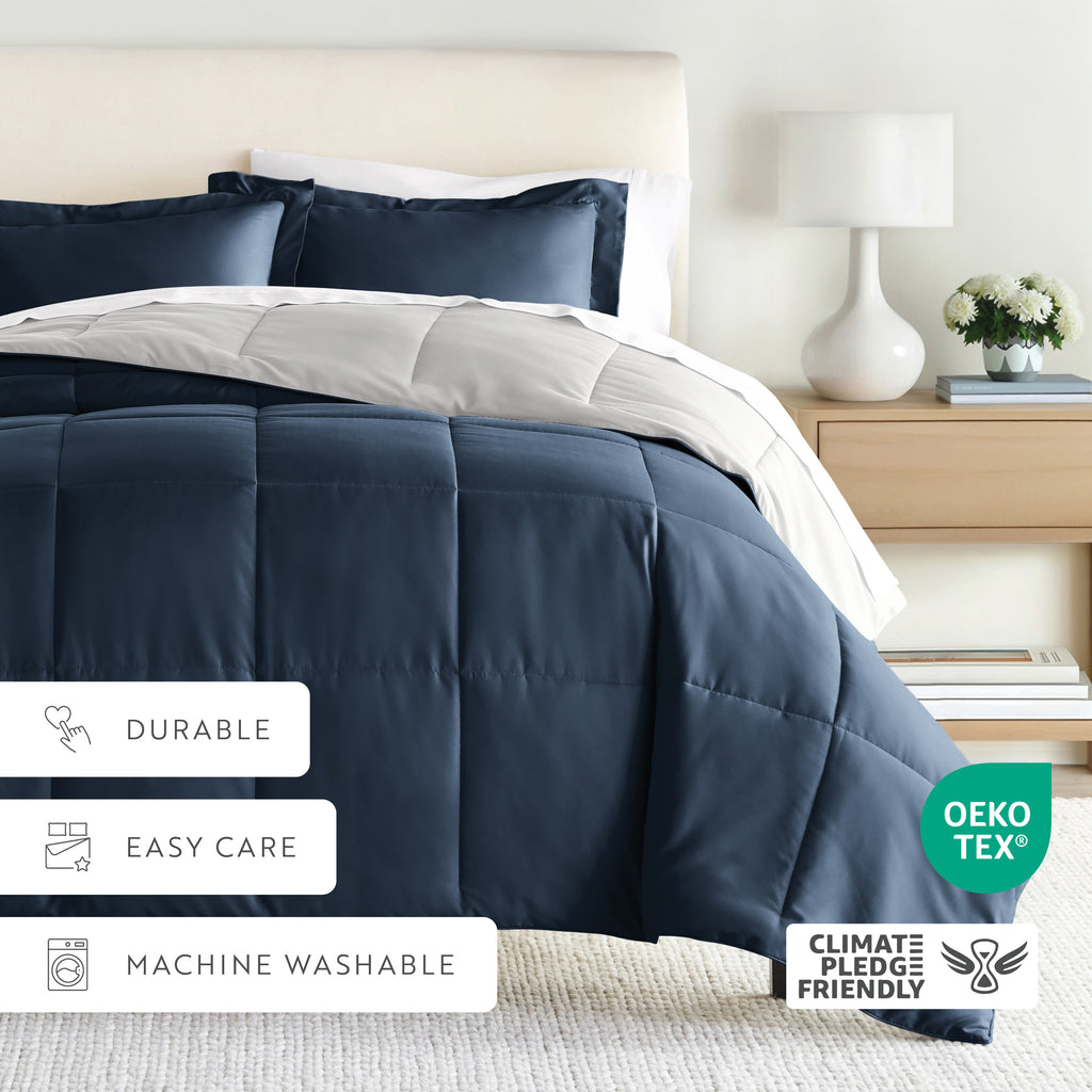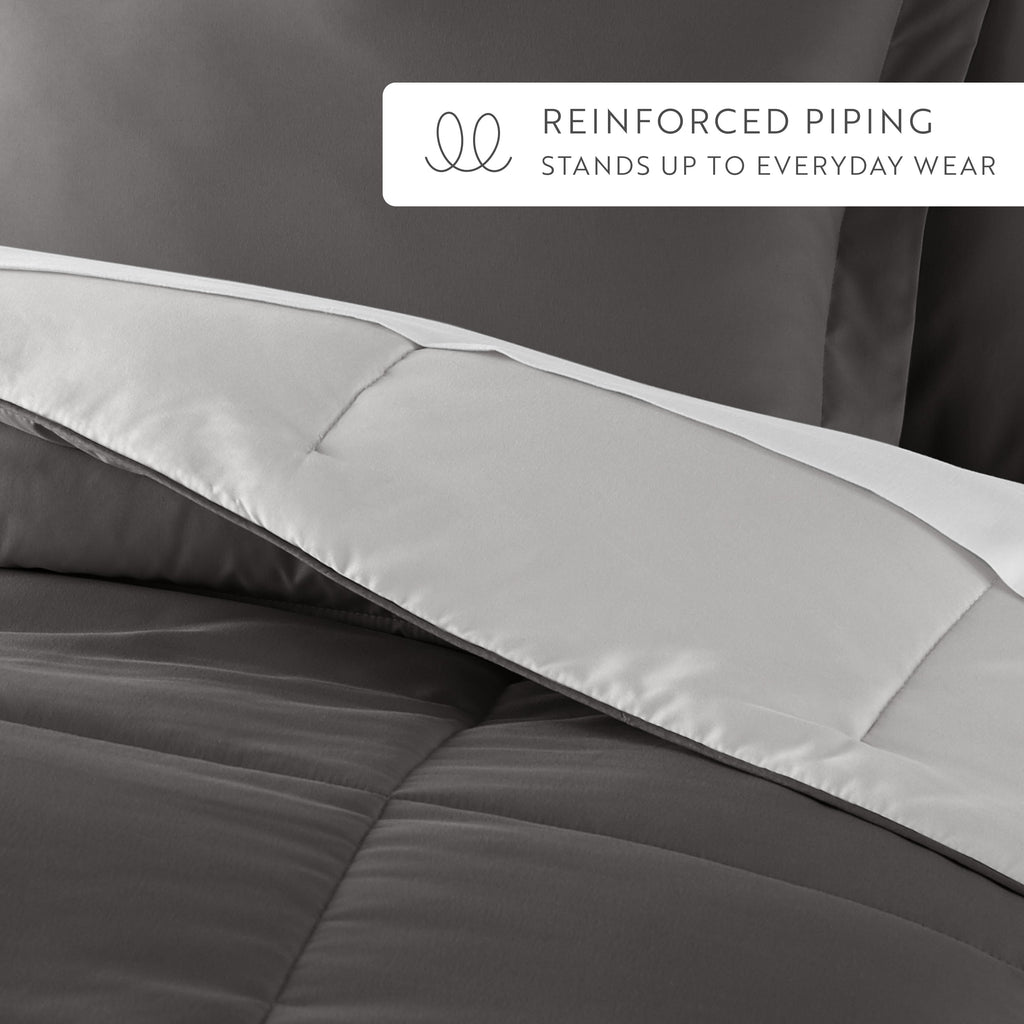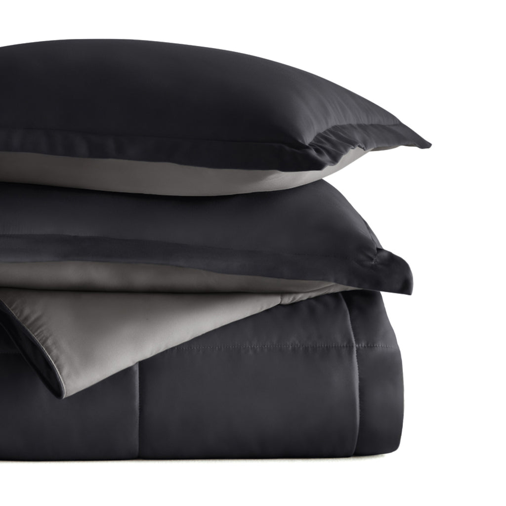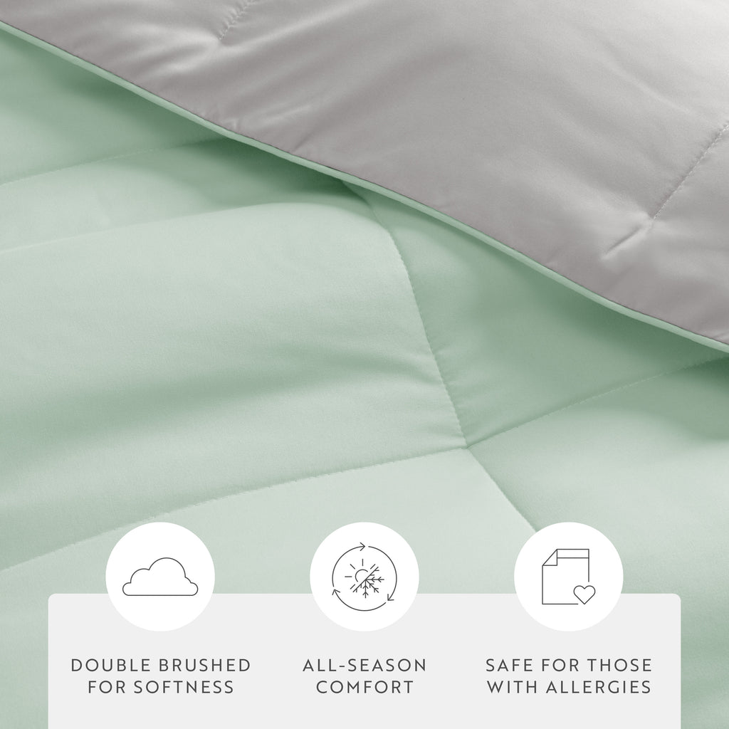 Give your bedding a brand new look and feel with this lightweight, all season reversible comforter set. Presenting a down alternative quality, it's incredible softness makes it the perfect comforter to keep you cozy all year round. The sewn through box stitching prevents the fibers from shifting. Featuring a reversible design of aesthetically matched colors, this set is ideal for making quick style changes to your sleep space!