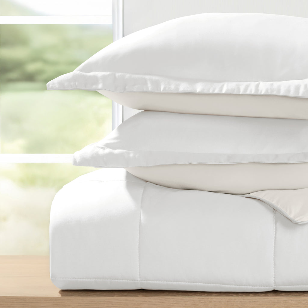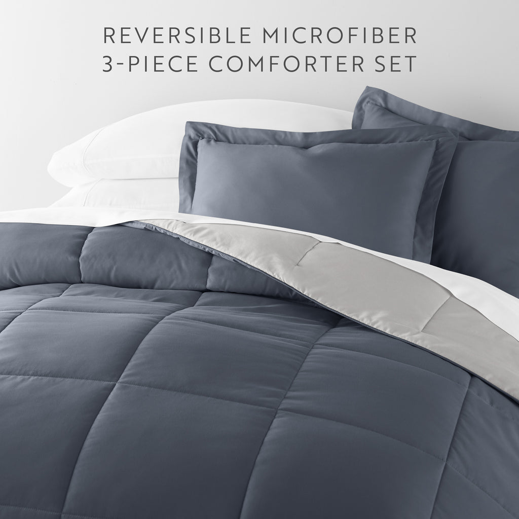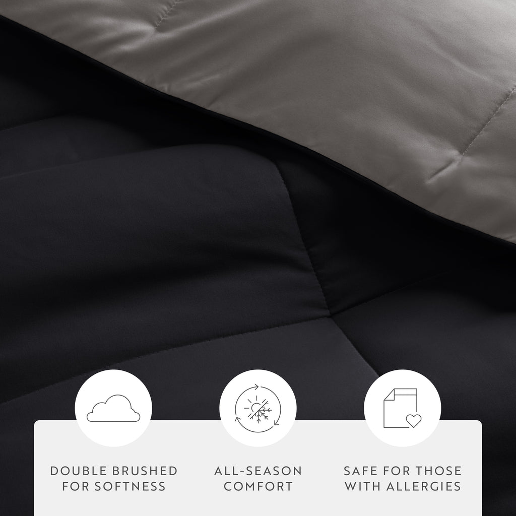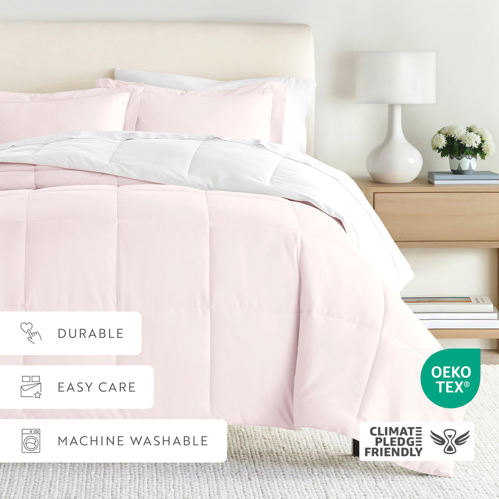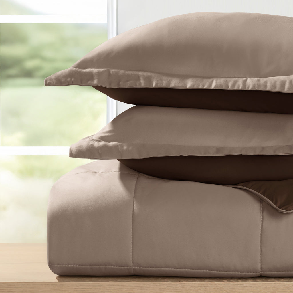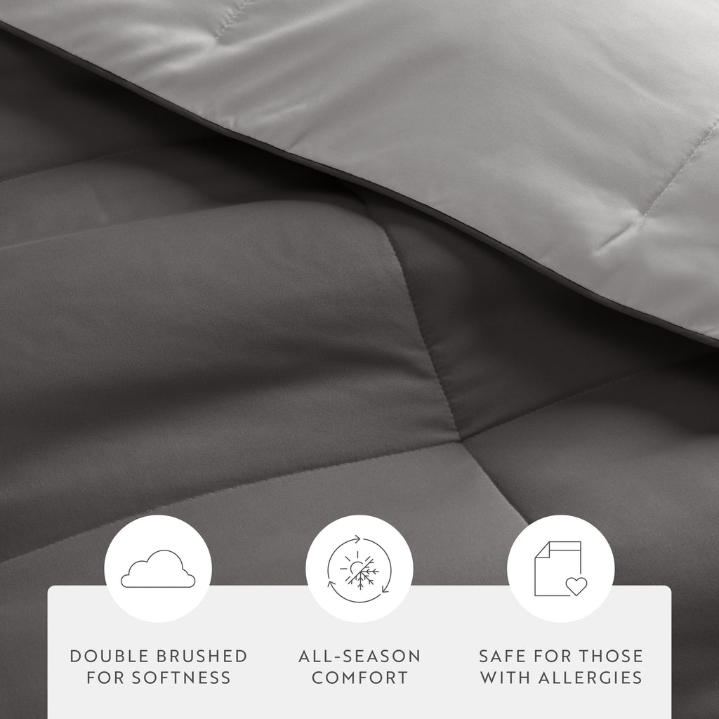 Give your bedding a brand new look and feel with this lightweight, all season reversible comforter set. Presenting a down alternative quality, it's incredible softness makes it the perfect comforter to keep you cozy all year round. The sewn through box stitching prevents the fibers from shifting. Featuring a reversible design of aesthetically matched colors, this set is ideal for making quick style changes to your sleep space!