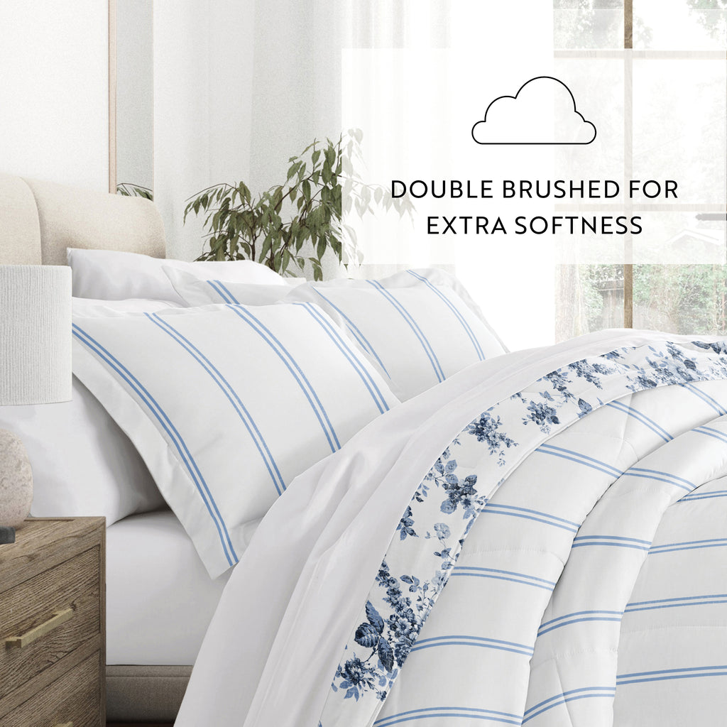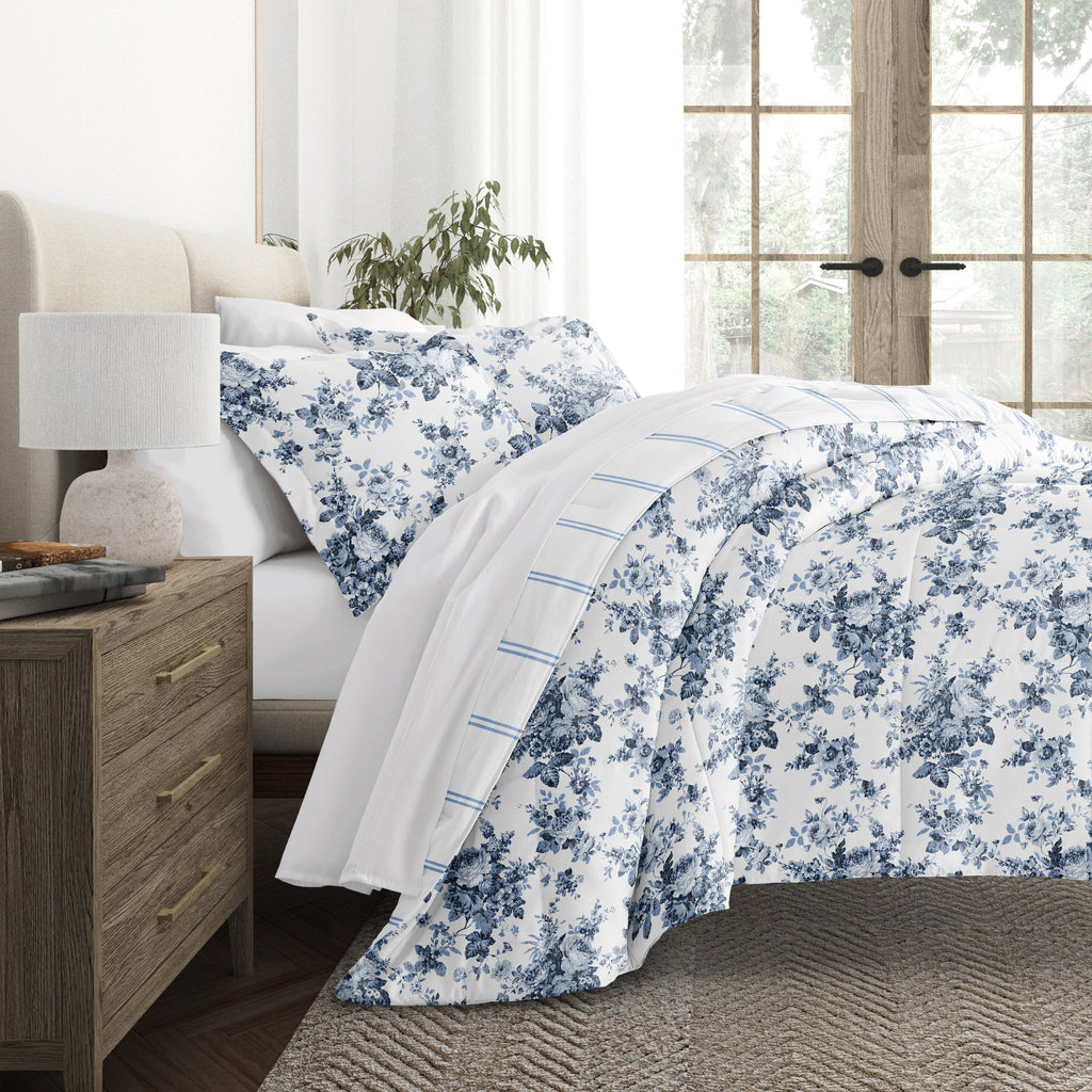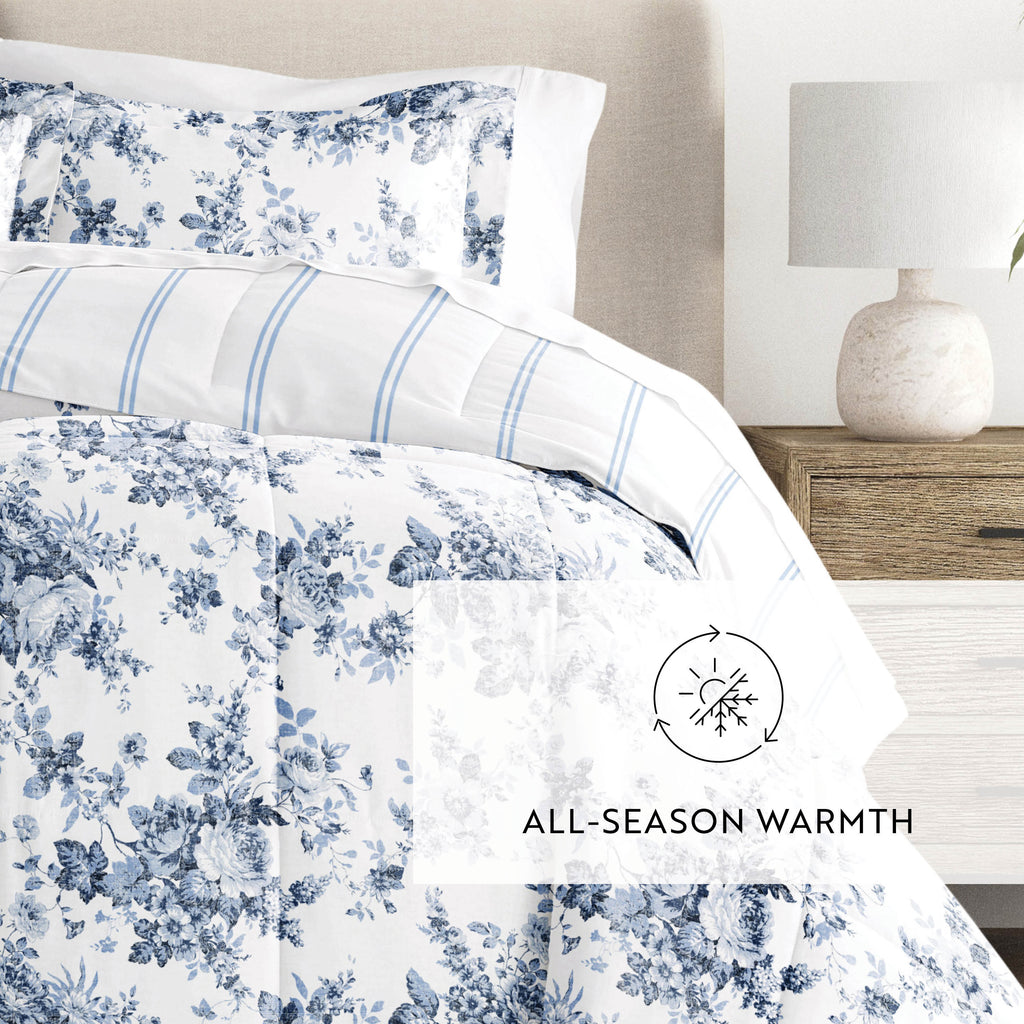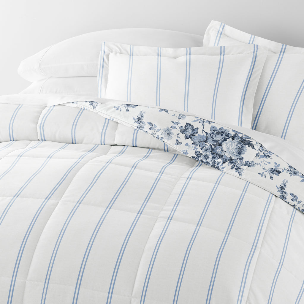 Cabbage Rose Stripe Reversible Patterned Down-Alternative Comforter Set
