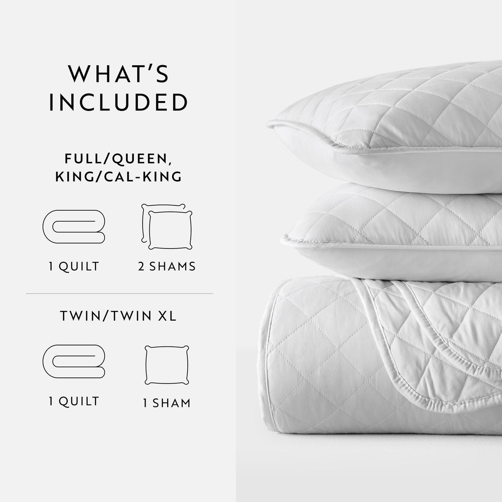 - KING/CAL-KING: 1 quilt (108" x 96") and 2 King pillow shams (20" x 36")