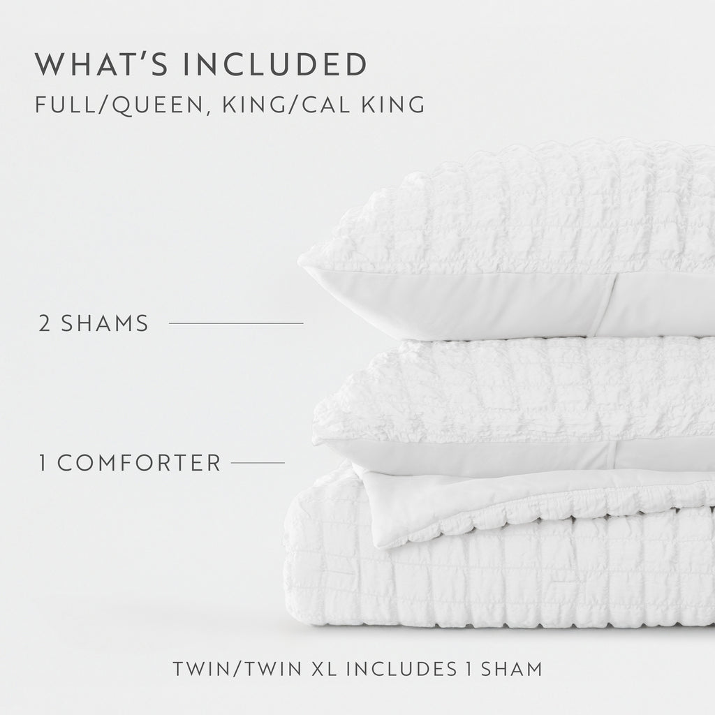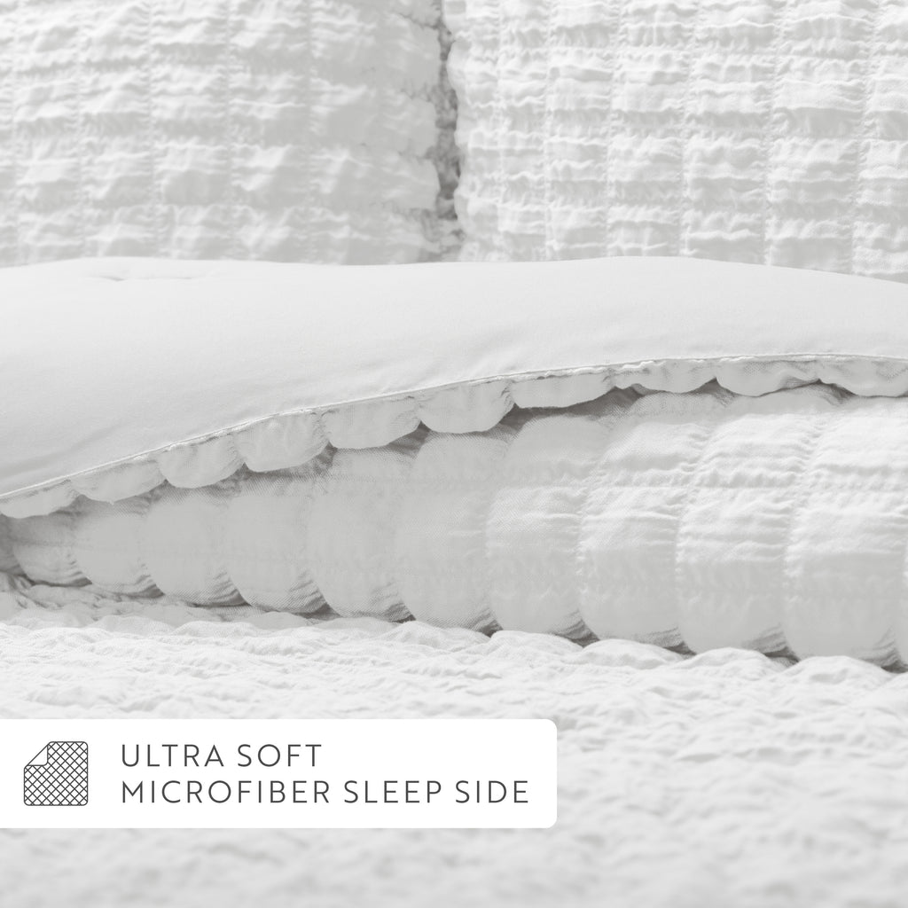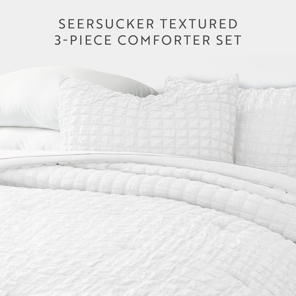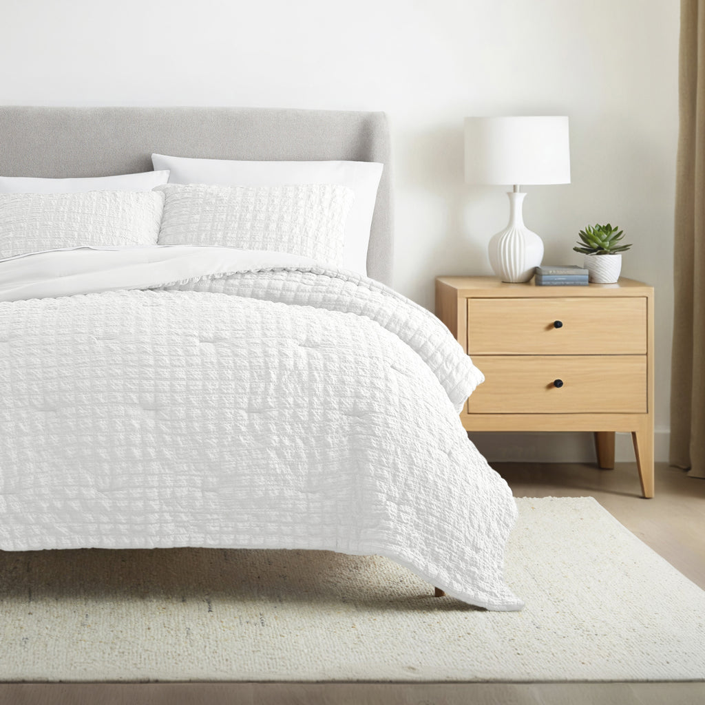 This lightweight, all-season comforter set features a soft, breathable seersucker fabric with a subtle crinkled texture that adds dimension and elegance. The plush down-alternative fill delivers year-round warmth and comfort, making it an ideal bedding solution for a wide range of climates and properties.