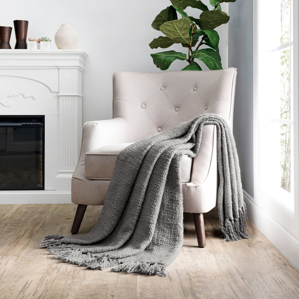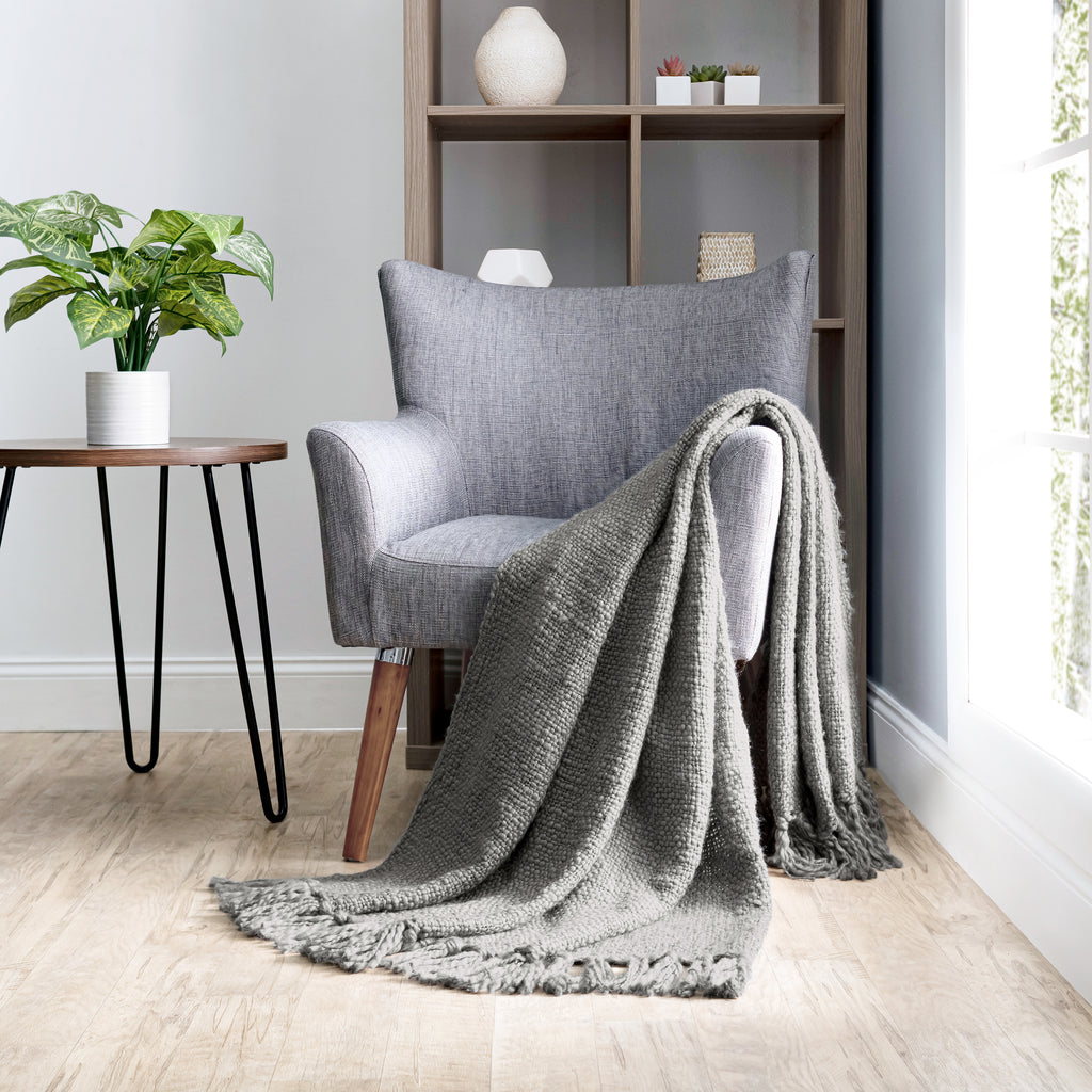 Our solid basketweave throw's large scale texture and intriguing fringe are achieved by using ultra-soft yarns of varying thickness and slubs. The result is a medium weight knit throw that is extra cozy and oh-so-inviting. Perfect for a quick refresh of any space, or lounging around!