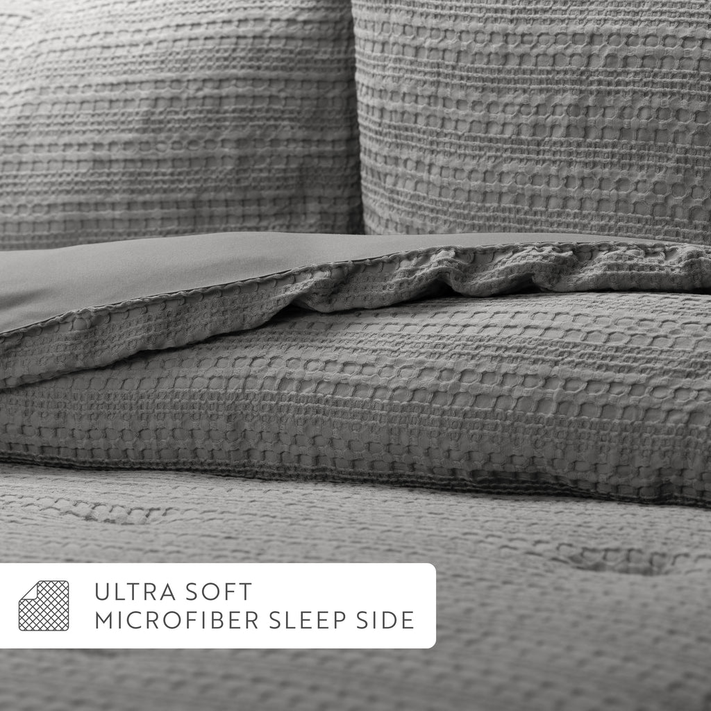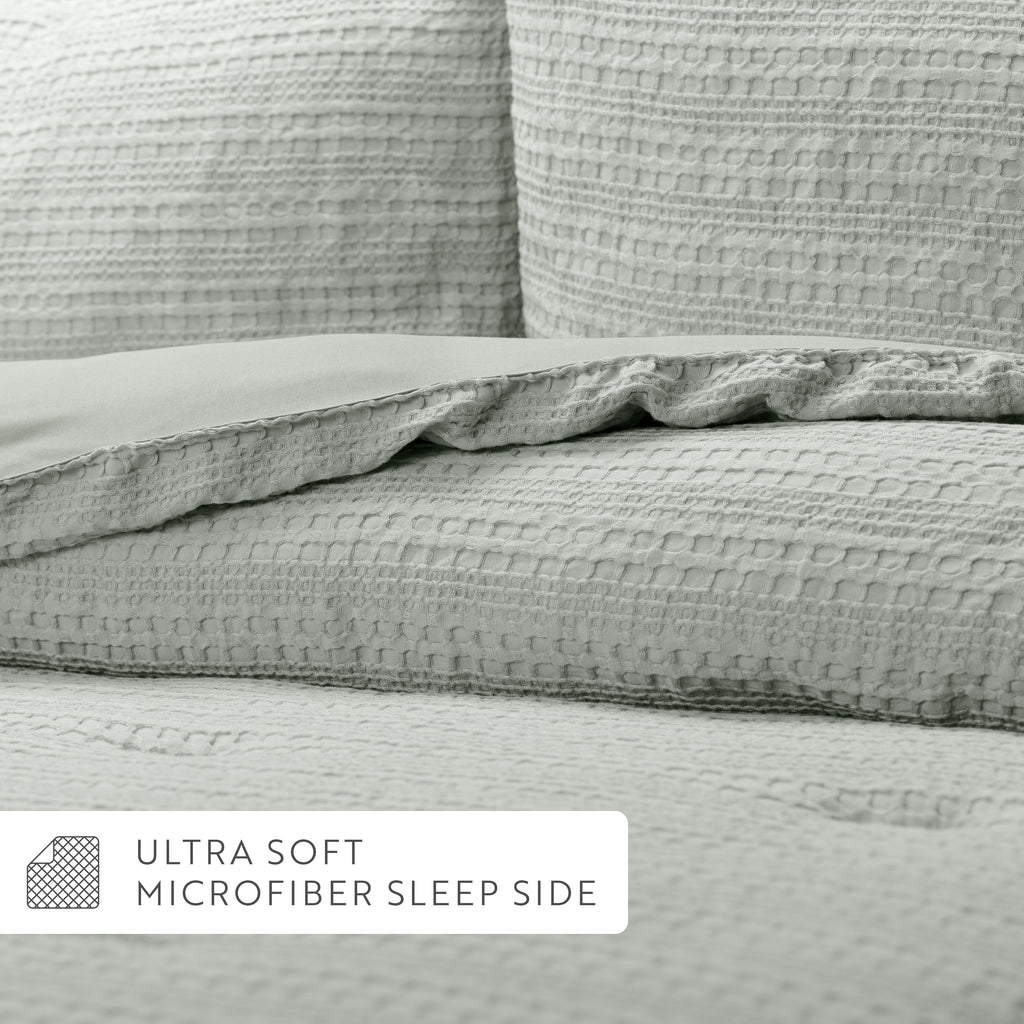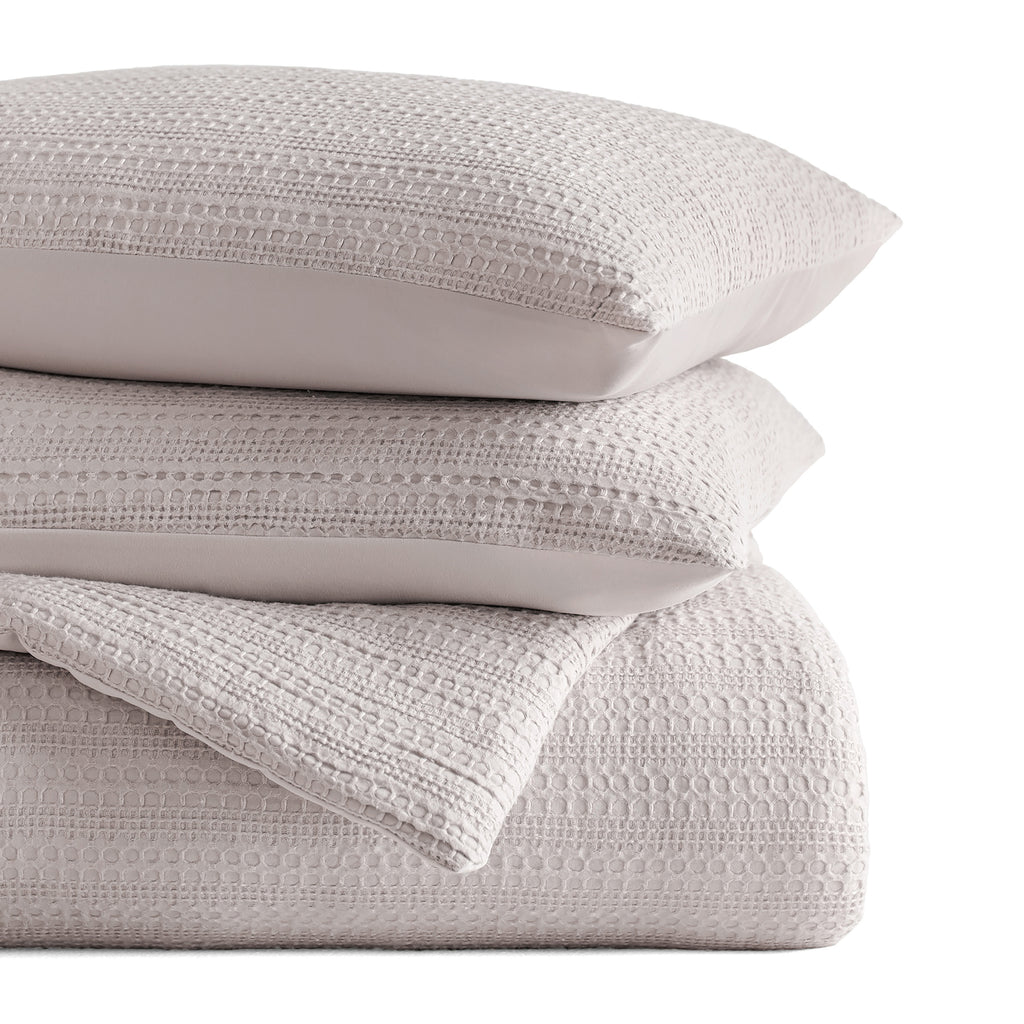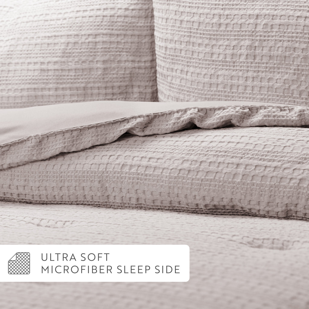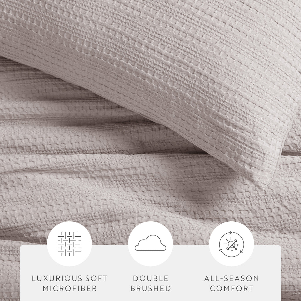 This set features an ultra-soft, double-brushed microfiber fabric with a pre-washed finish, offering a lived-in feel and exceptional softness your customers will appreciate. The elegant waffle texture adds subtle dimension, while the polyester fill ensures lightweight warmth year-round.