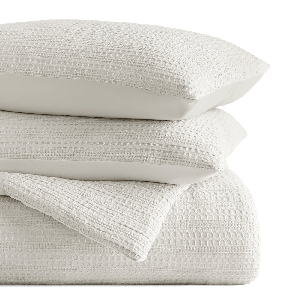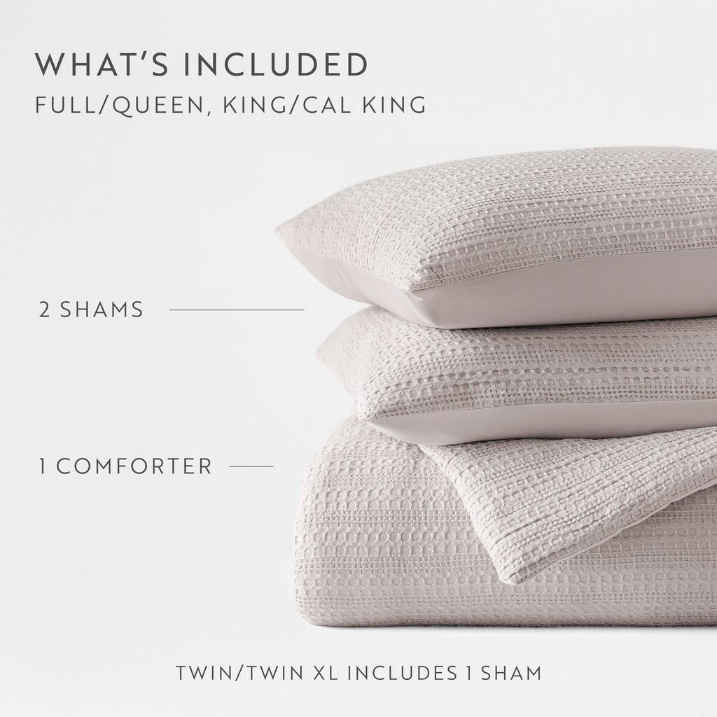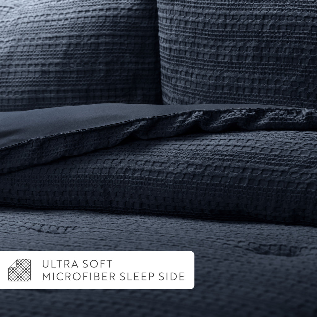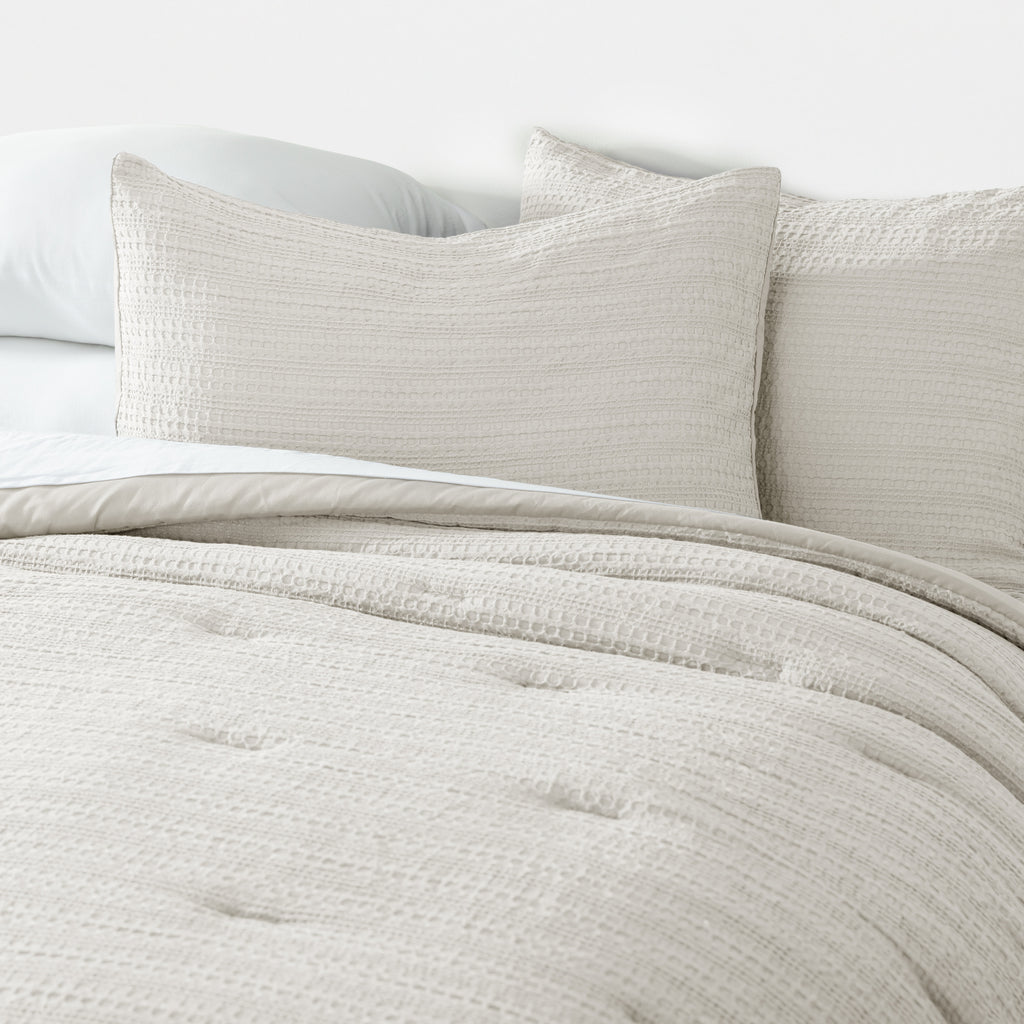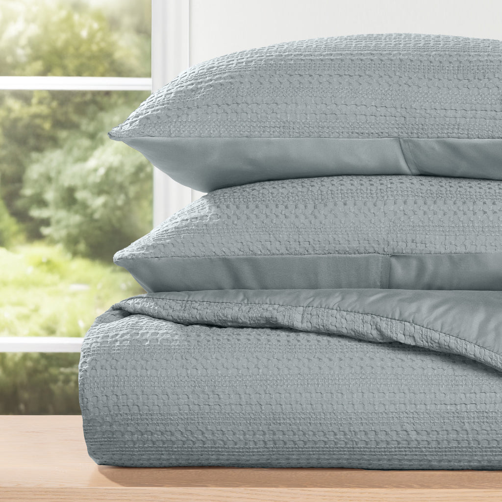 This set features an ultra-soft, double-brushed microfiber fabric with a pre-washed finish, offering a lived-in feel and exceptional softness your customers will appreciate. The elegant waffle texture adds subtle dimension, while the polyester fill ensures lightweight warmth year-round.