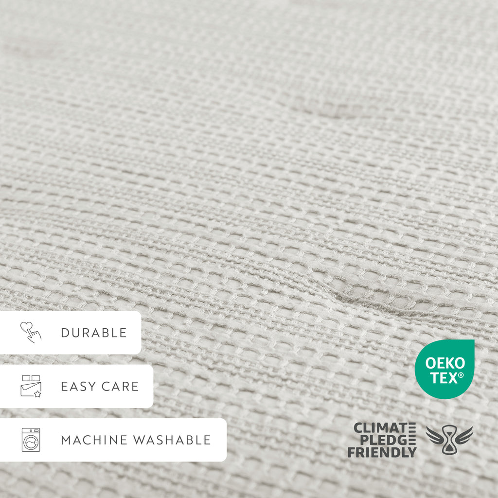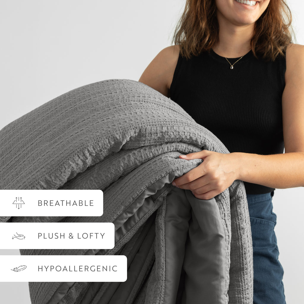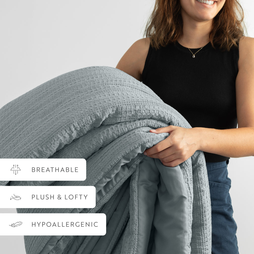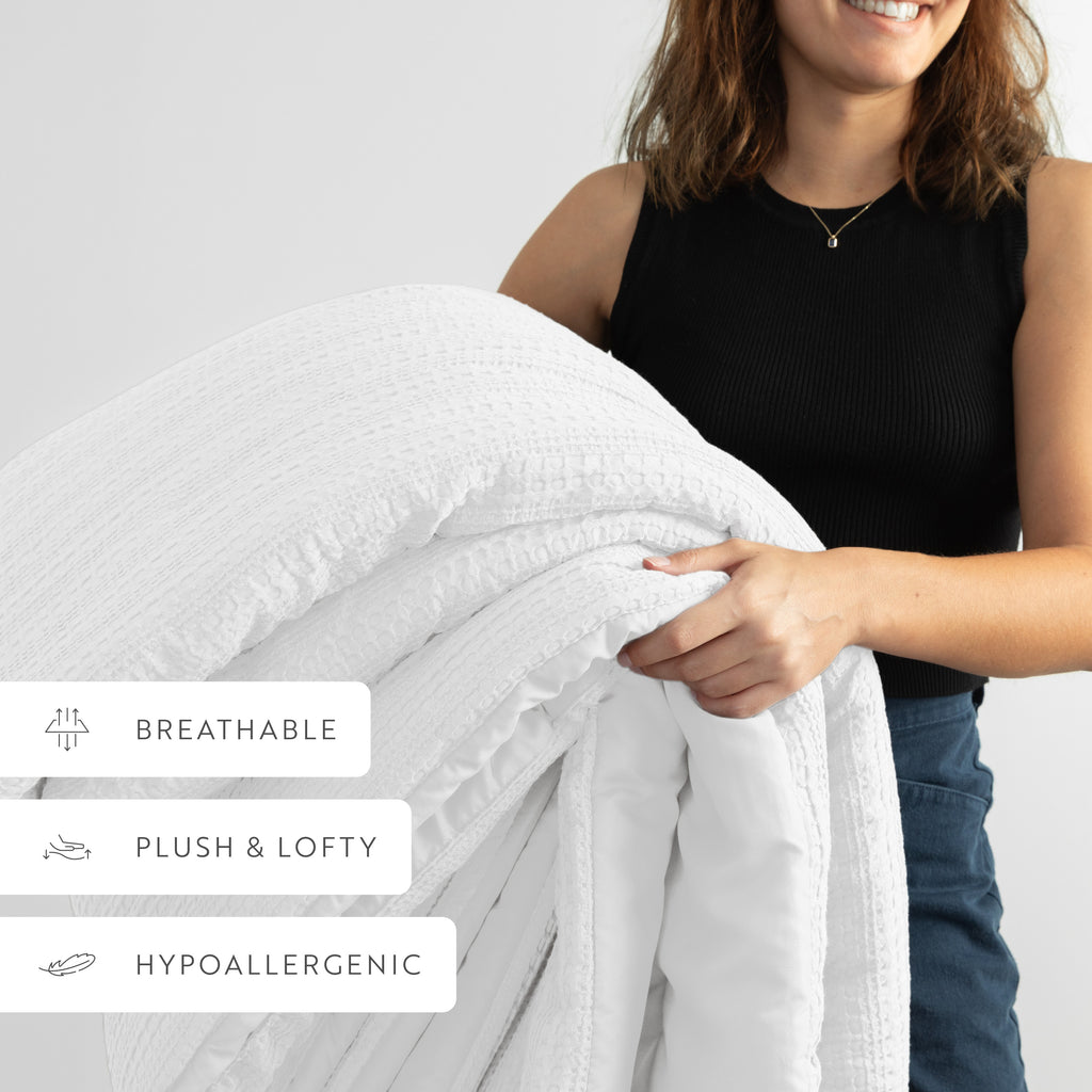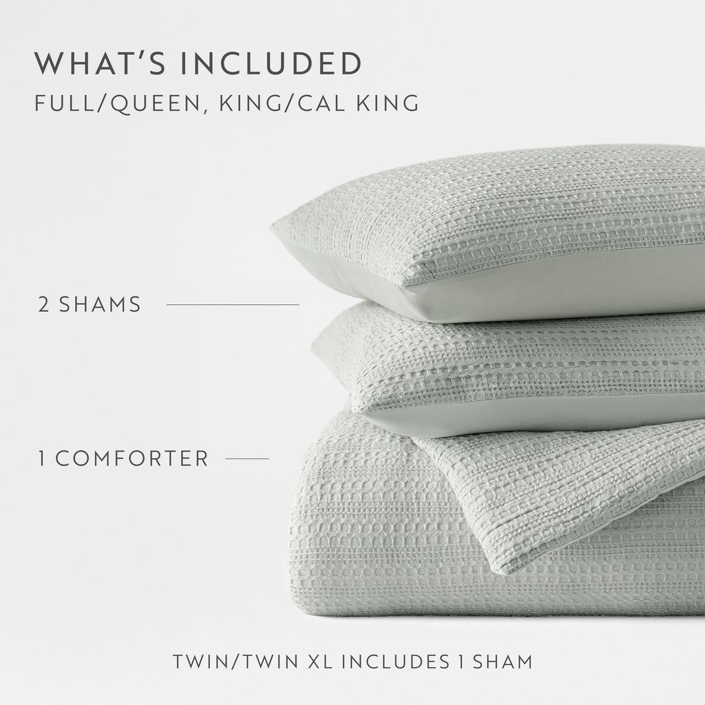 This set features an ultra-soft, double-brushed microfiber fabric with a pre-washed finish, offering a lived-in feel and exceptional softness your customers will appreciate. The elegant waffle texture adds subtle dimension, while the polyester fill ensures lightweight warmth year-round.